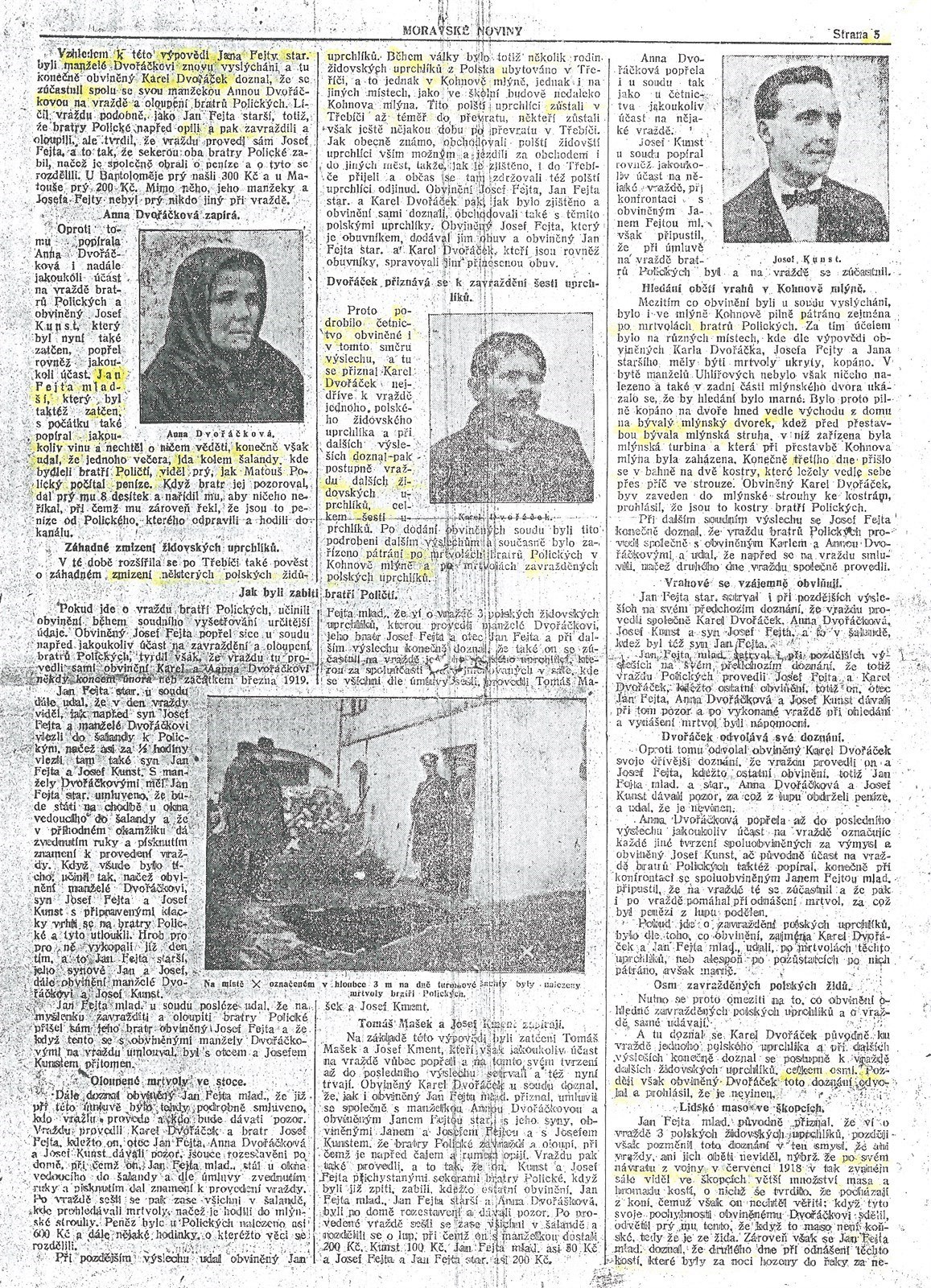 Během výpovědí házeli obvinění vinu jeden na druhého. Nakonec se ale přiznali k dalším zločinům, o kterých neměli vyšetřovatelé ani tušení. Koncem války zabili nejspíš osm polských Židů. „Jednoho večera v létě 1918 přišel asi padesátiletý židovský polský uprchlík za Fejtou s tím, má-li jeho boty již opraveny. Když odcházel, vzal ho obviněný Josef Fejta za ruku, nabídnuv se mu, že ho vyvede bližší cestou,“ popsaly tehdy jednu z výpovědí Moravské noviny.