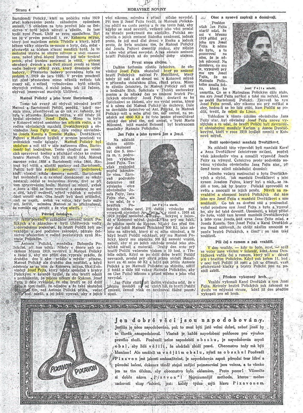 Jak k půlnoci stoupal alkohol do obecních hlav, u stolu tichého synka se objevil jistý Dvořáček. Ošklivý, zarputilý, hloupý a vypočítavý dělník, který žil v třebíčském Kohnově mlýně. A začal se vytahovat. „Já bych klidně mohl říct, kde jsou jejich mrtvoly. Vše přesně ví Fejta, ať se ho zeptají,“ vyhrkl v alkoholovém opojení.
