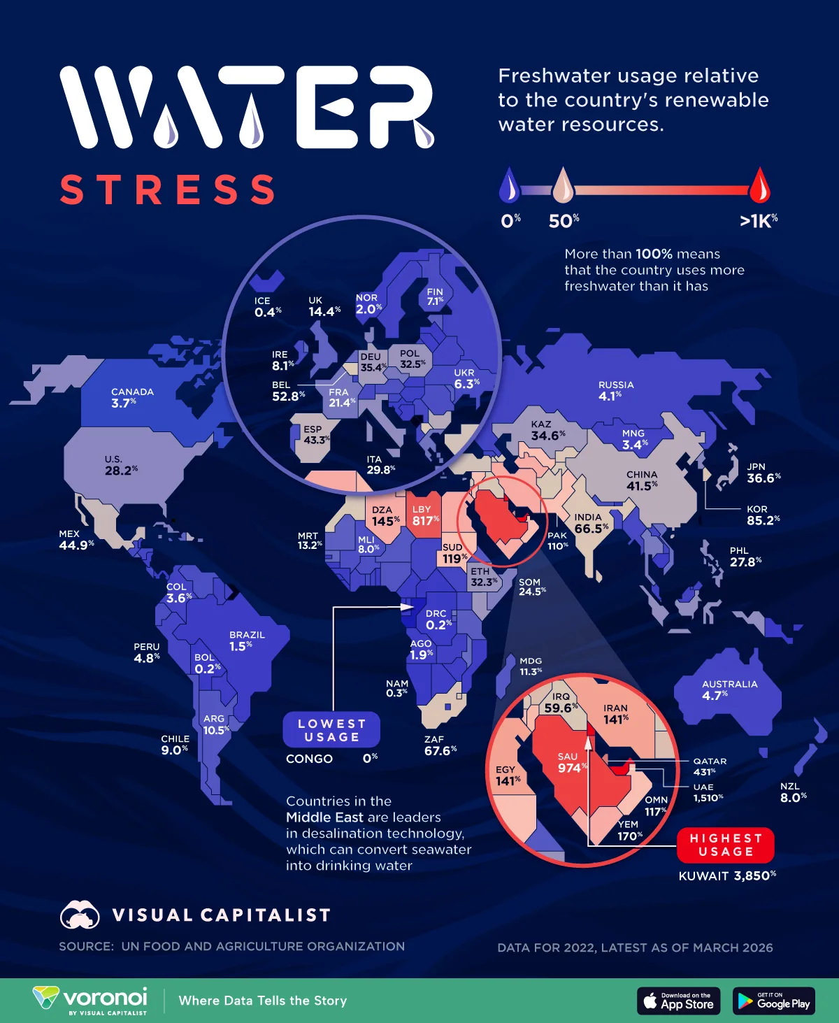 Tato mapa znázorňuje vodní stres podle zemí, měřený jako odběr sladké vody v poměru k obnovitelným vodním zdrojům. Země se skóre nad 100 % spotřebovávají každý rok více vody, než je přirozeně k dispozici, a často se spoléhají na vyčerpávání podzemních vod nebo odsolování, aby tento rozdíl překlenuly. Data pocházejí z Organizace OSN pro výživu a zemědělství.